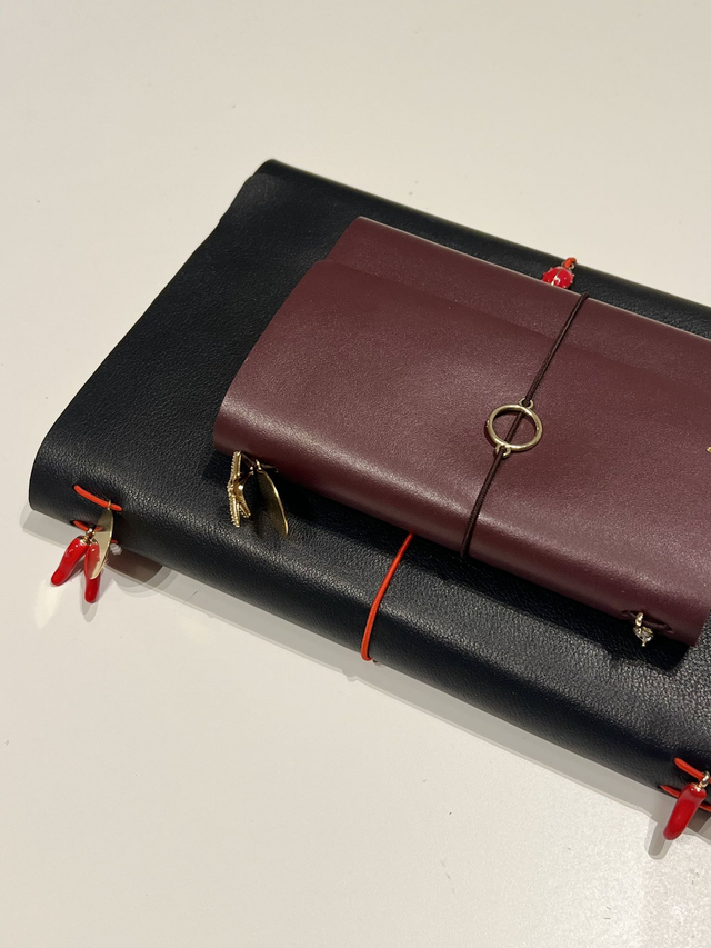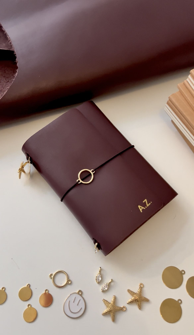 Du wählst Leder, Gummibandfarben und Charms und kannst Namen, Initialen oder Wörter ins Leder sowie auf kleine Metallanhänger gravieren. Es gibt zwei Größen zur Auswahl: DIN A5 – klassisches Notizbuchformat und Kompakt – perfekt für die Handtasche, mit Platz für den Pass.